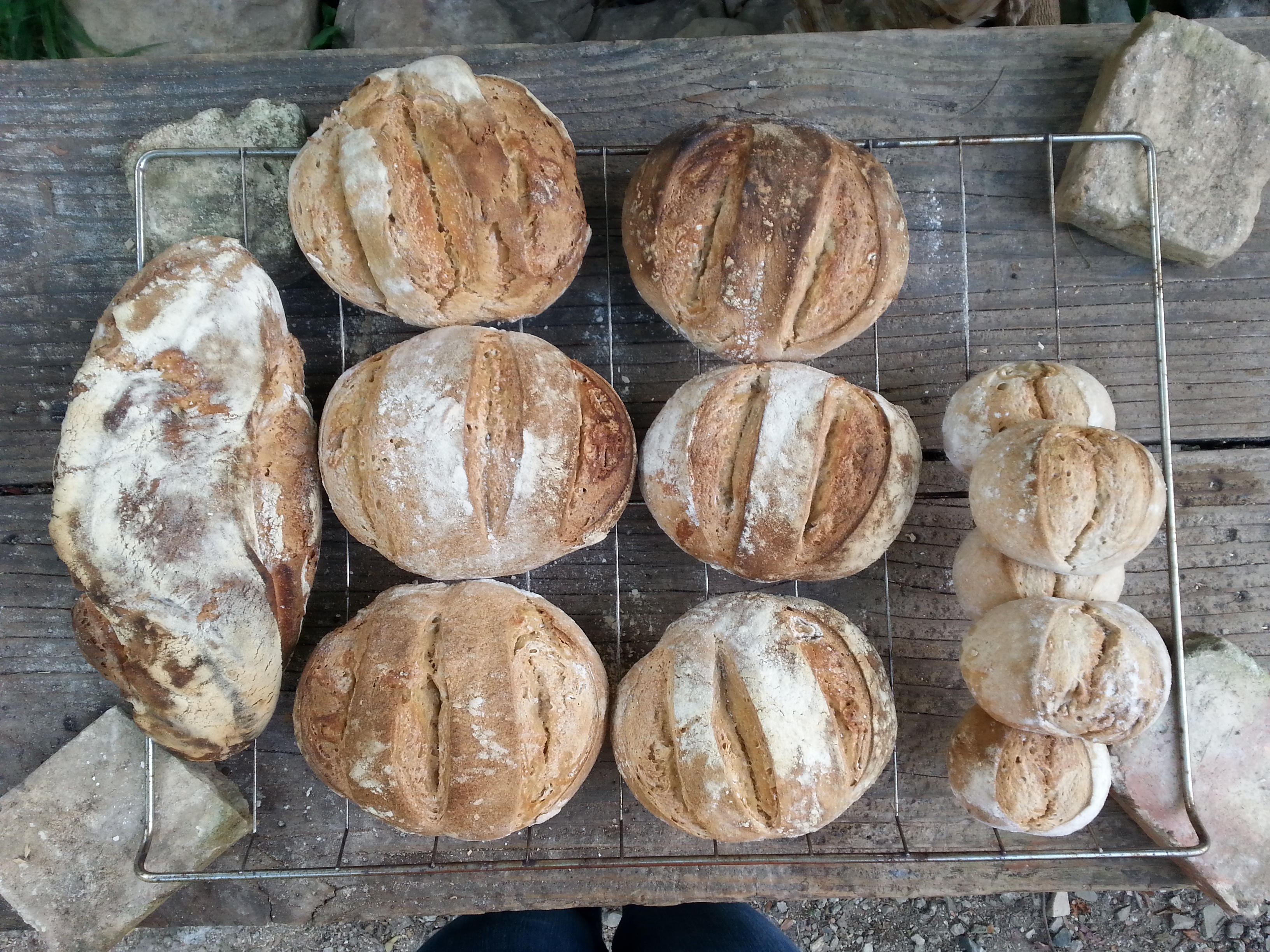 This batch was certainly worth all the hard work, and the oven cooked beautifully…once I remembered to remove the brick blocking the chimney! Before that, not so good on the heating side of things. Pulling several oven loads of bread out of the oven, one after another, is incredibly satisfying, particularly after two days of nurturing the sourdough, feeding it, kneading it, shaping it…