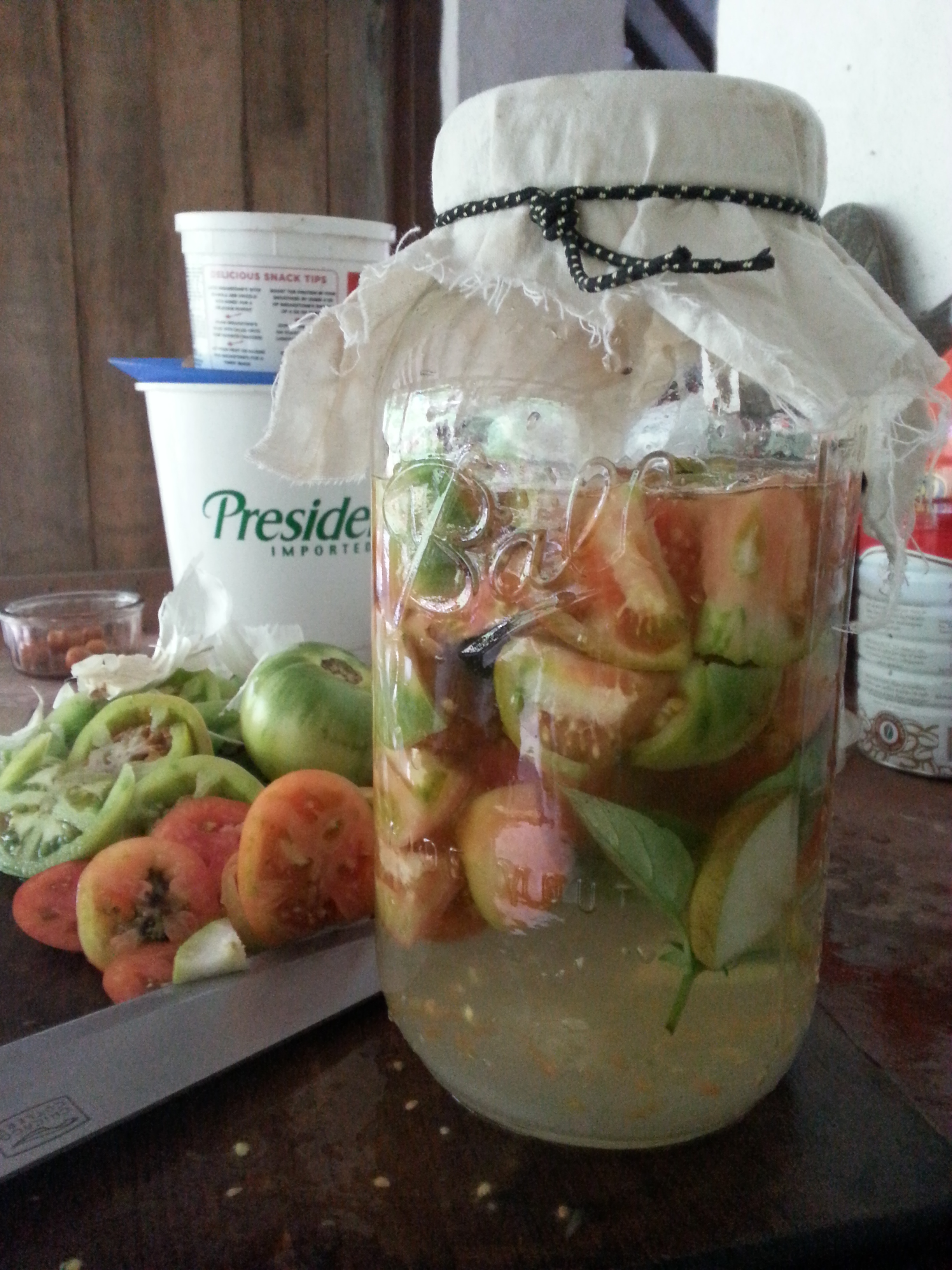 In other matters around the property, we’ve had an influx of tomatoes, both ripe and green from Paul (our tenant and neighbour), so early in the week I set some tomato vinegar and some green tomato lactobacillus pickles to set – the vinegar is just chopped tomato in a sugar solution, the pickles are chopped green tomato, seasoning peppers, garlic, and spices in the saline solution, weighted in the antique pickle crock that my Mom gave me this winter. The pickles will sit for a couple of weeks until pickly, while the vinegar will be strained today and then set to cure for a couple more weeks – much like making wine, but purposely contaminating it so that it instead turns to vinegar. It’s been raining every day, sometimes for hours, which whilst annoying for the building is great for the garden! I have a brand new row of greens coming up nicely (dug and seeded less than 5 days ago) and the rows I’d planted out (started in seed trays) 1-2 weeks ago are already producing greens and basil. An old BBQ of the horizontal barrel shape was just found at one of the dumps, so that will shortly be a raised bed for some cucumbers, which if planted in the ground here immediately get devoured by aphids – an ongoing problem that I’m determined to circumvent without the use of chemicals!