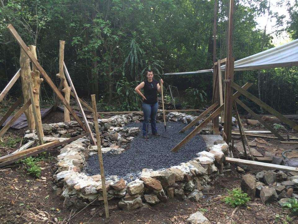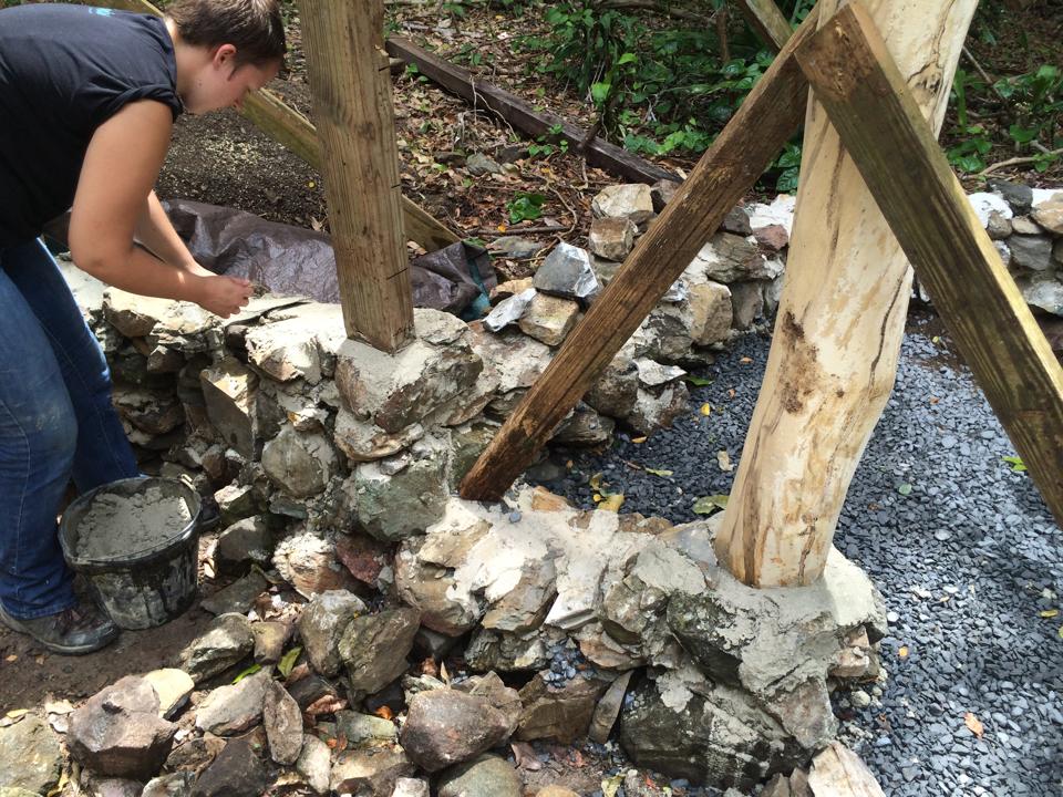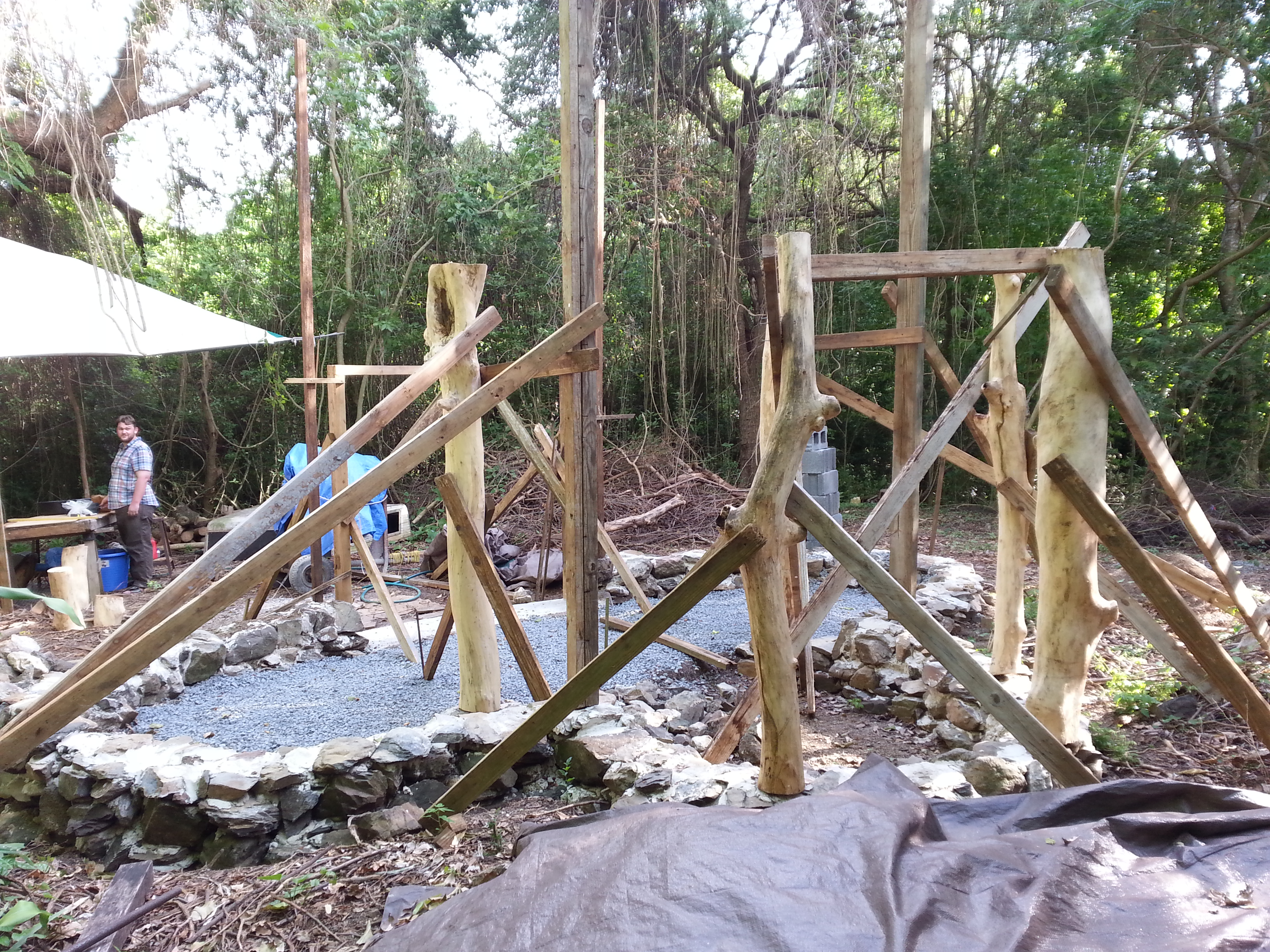 It’s been such a busy, beautiful, productive week that I’m not even sure where to start! It was gorgeous and sunny for my brother’s entire visit, and with his 6’4″ of help I was able to make some admirable progress on the Nid. We’re now all ready to put in a temporary loft floor to use as scaffolding for building the roof and walls, having erected and trimmed all of the loft posts and the four tallest posts for the main roof. It was a week of a little carpentry, a little chainsawing, and a little masonry…plus the concrete pour to make the sill for the front door. Whew!