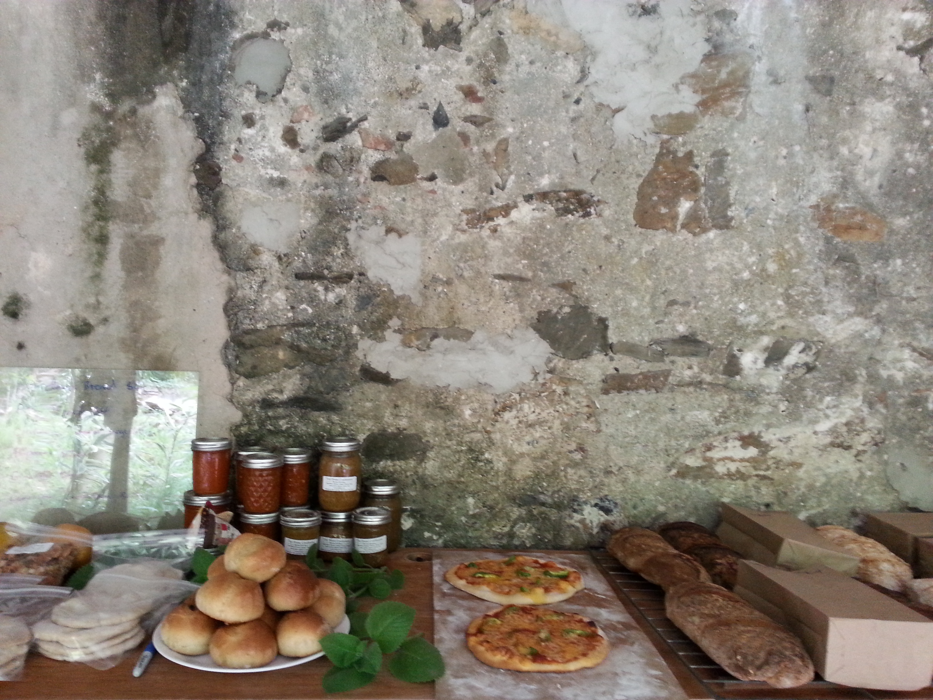 Last Saturday: toasties, pita, chutneys, sweet rolls, lunch pizza, rye sourdough, and whole grain sourdough!