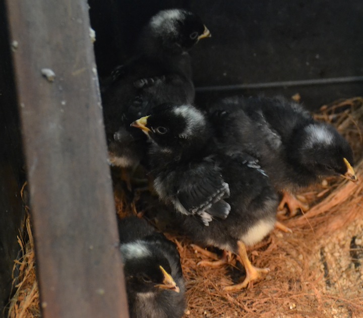 In other news, we now have baby chicks! On Monday I suddenly acquired 6 week-old Barred Rock pullets, cute little black-and-white bundles of fluff, squeaks, and poop. One sadly didn’t make it, but the remaining 5 have nearly doubled in size and will doubtless soon be trying to escape their makeshift brooder! As soon as they are old enough to be outside they’ll get moved into my original chicken tractor, while my older hens continue to roost in the new one at night, and get to free range most of the day – until their privileges get revoked when they cause too much damage in the vegetable garden.