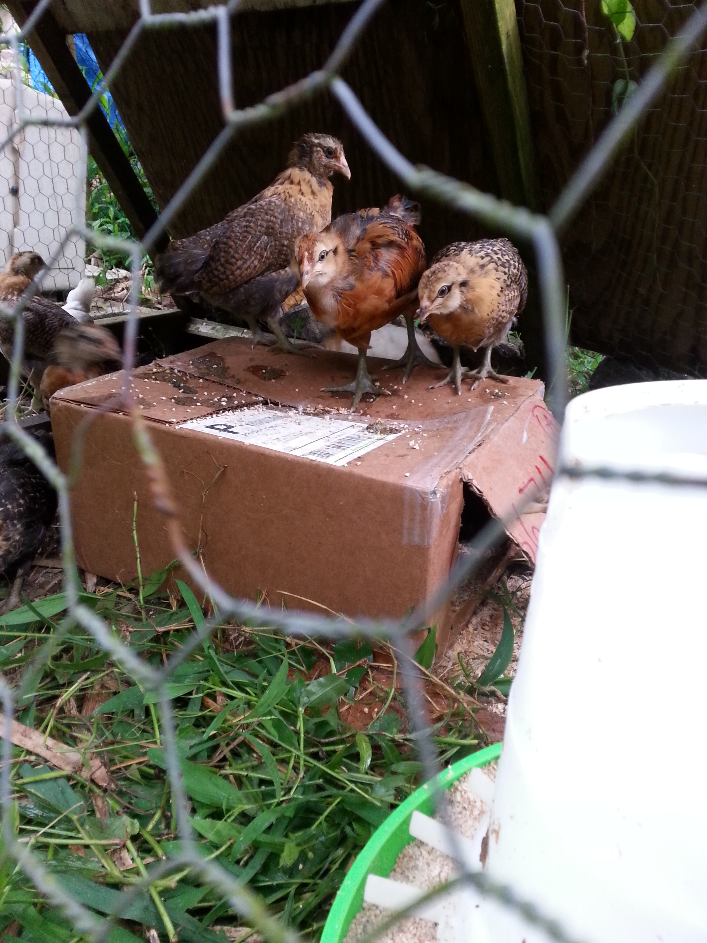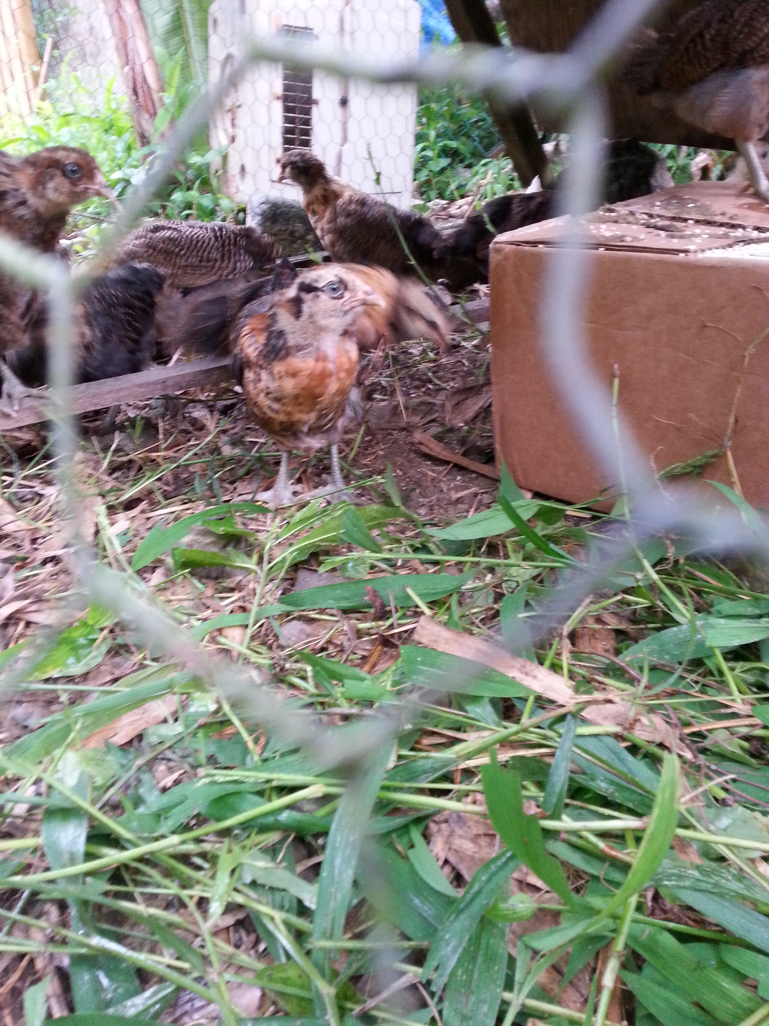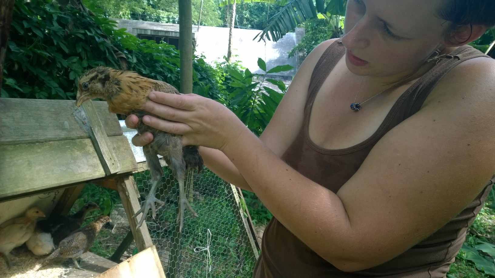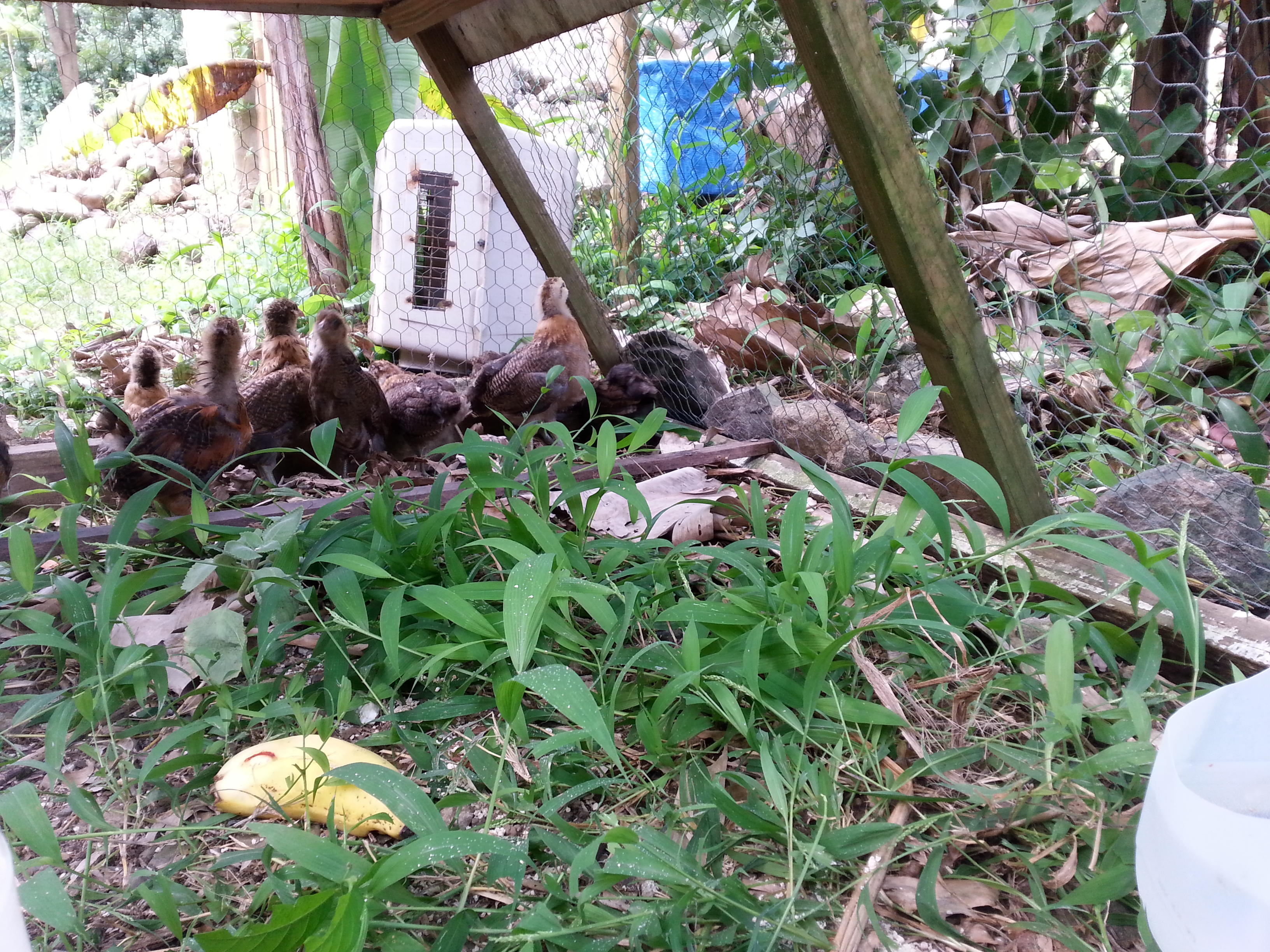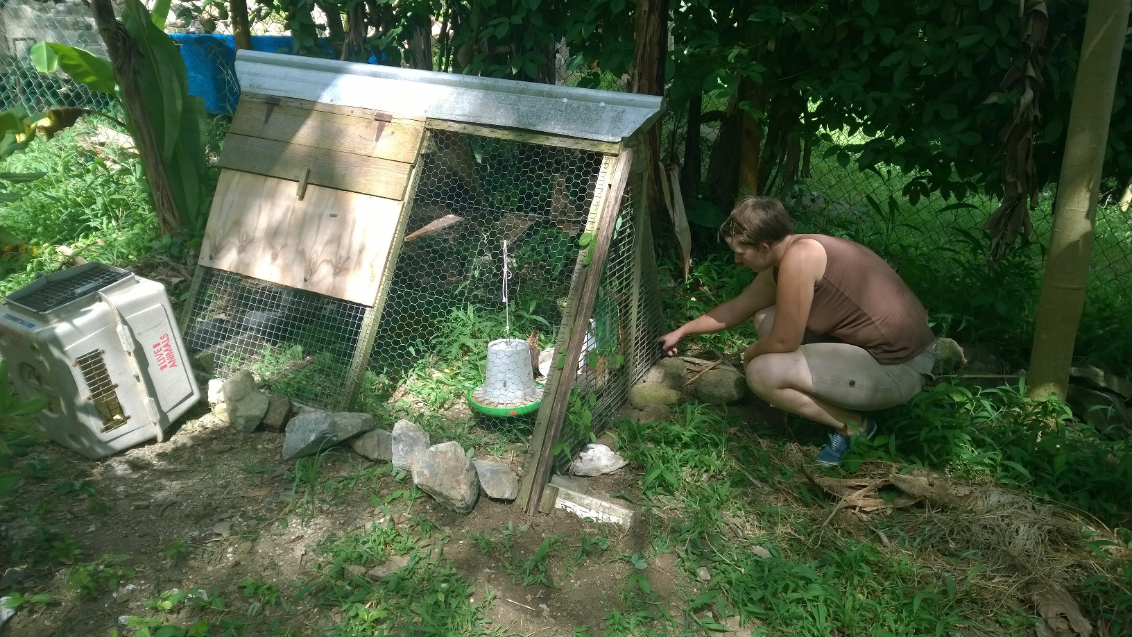 The chicks are now moved into their outdoor coop–a chicken tractor dug into a trench with rocks around it for mongoose-proofing–leaving us with a little more space on our porch! They seem to be very happy with their new abode, even if they haven’t yet figured out the whole concept of sleeping upstairs, playing downstairs. I get to be a good chicken-mother and put them to bed at night. Oh, and we think that one of the “pullets” is rather…um…not a pullet. “She” has rather longer tail feathers and a singularly “cocky” attitude…