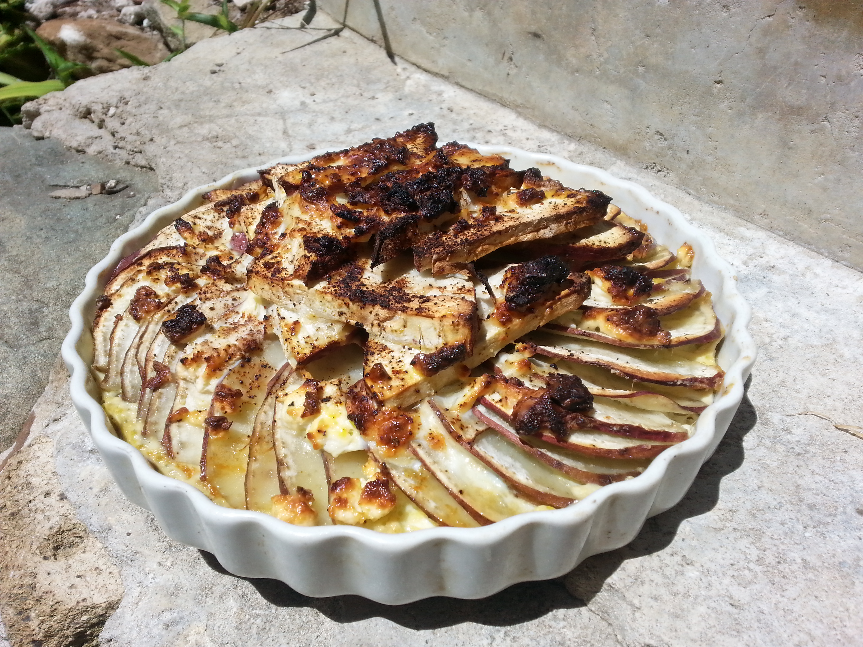 In a 10″ round baking dish lay the potato slices flat, in 1 or 2 layers. Then do the same with the onion. Then some basil and cheese. Then finally a layer of the sweet potato. Beat the egg, about 1 cup water or milk, salt, pepper, and some more cheese together, pour over the top. bake with foil over for 15min at 350ºF, then remove foil and bake another 15min. Enjoy hot or cold!