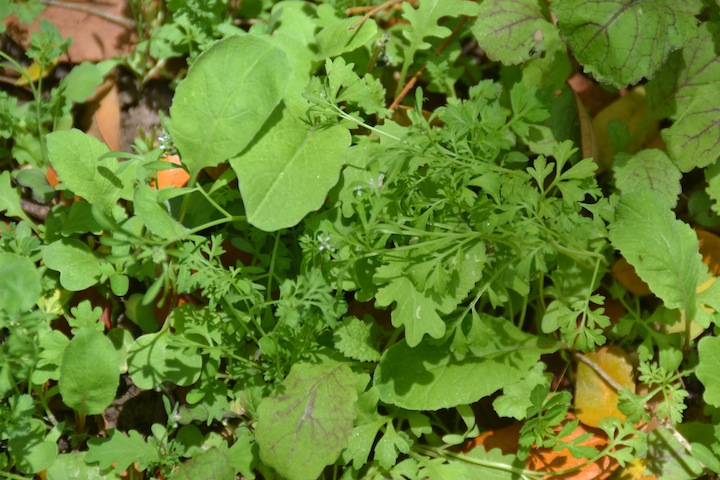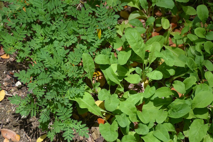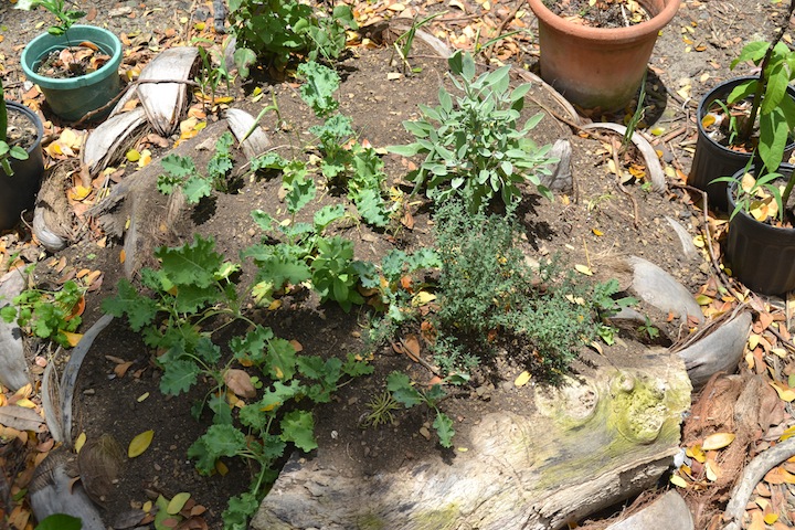 Kale and Purslane with natural leaf-mulch from the saman tree above.