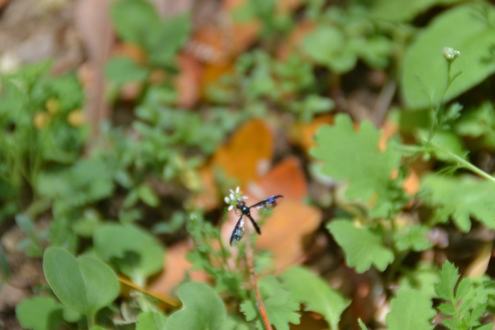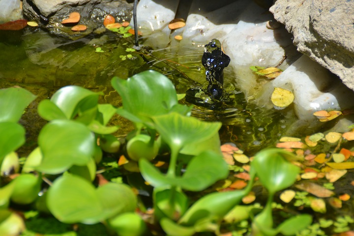 Solar powered “fountain” pump provides some water circulation in the pond – home to guppies, snails (no idea how they got here), and dragonfly larvae.