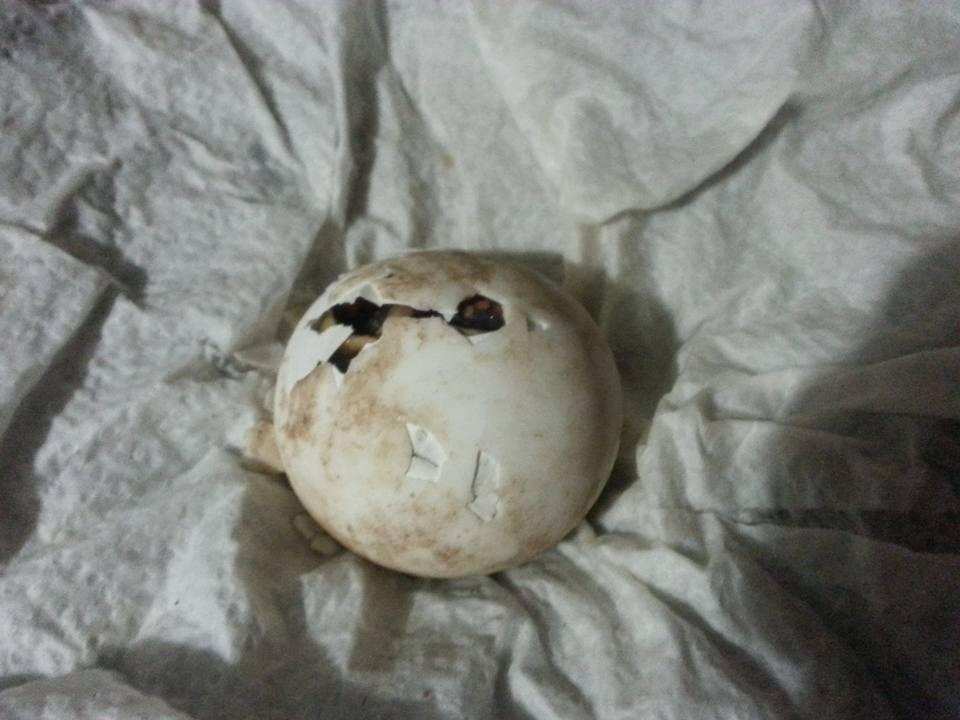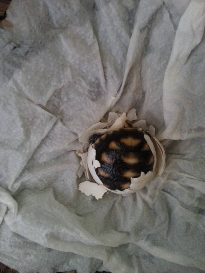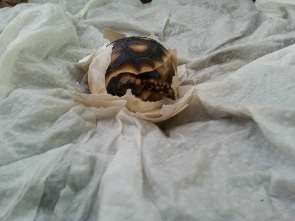 Or should I refer to it as an exit? This week we’ve been having a thrilling experience, watching the hatching of the first of five Red Footed Tortoise eggs that I’d found and relocated back in February. These eggs were laid by our “herd” of four adult tortoises, kept as a preservation effort and to consume excess garden and kitchen waste. After nearly 5 months, I saw a tiny flake of shell coming loose from one of the eggs, so I relocated the egg once more to a safe indoor hatching box where we could monitor her (due to the high temperatures during most of the incubation period, I feel comfortable in guessing that any hatchlings will be female) progress and be sure that ants and predators could not harm her during the highly sensitive 3-day hatching period, and the subsequent few days during which she will continue to absorb the yolk sac through a large opening in her very soft lower shell. Hatching is a long and arduous process for these cumbersome creatures: the following photos were taken over a 3 day period.