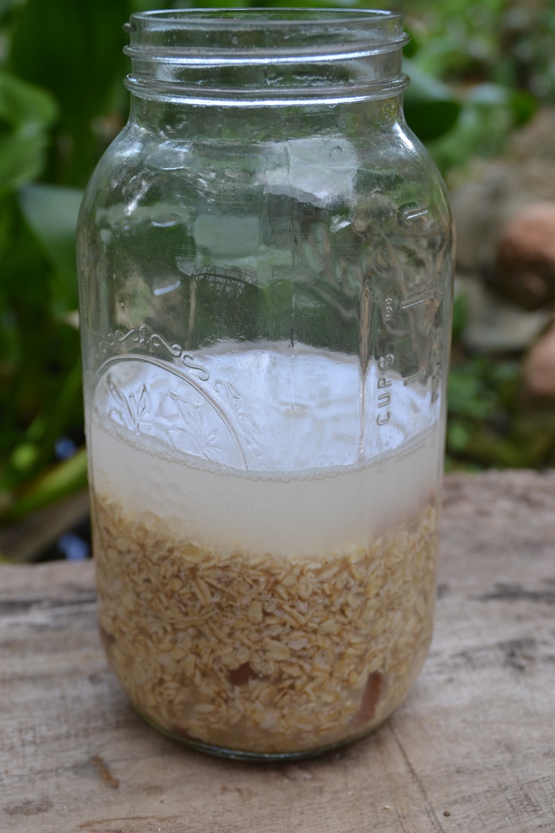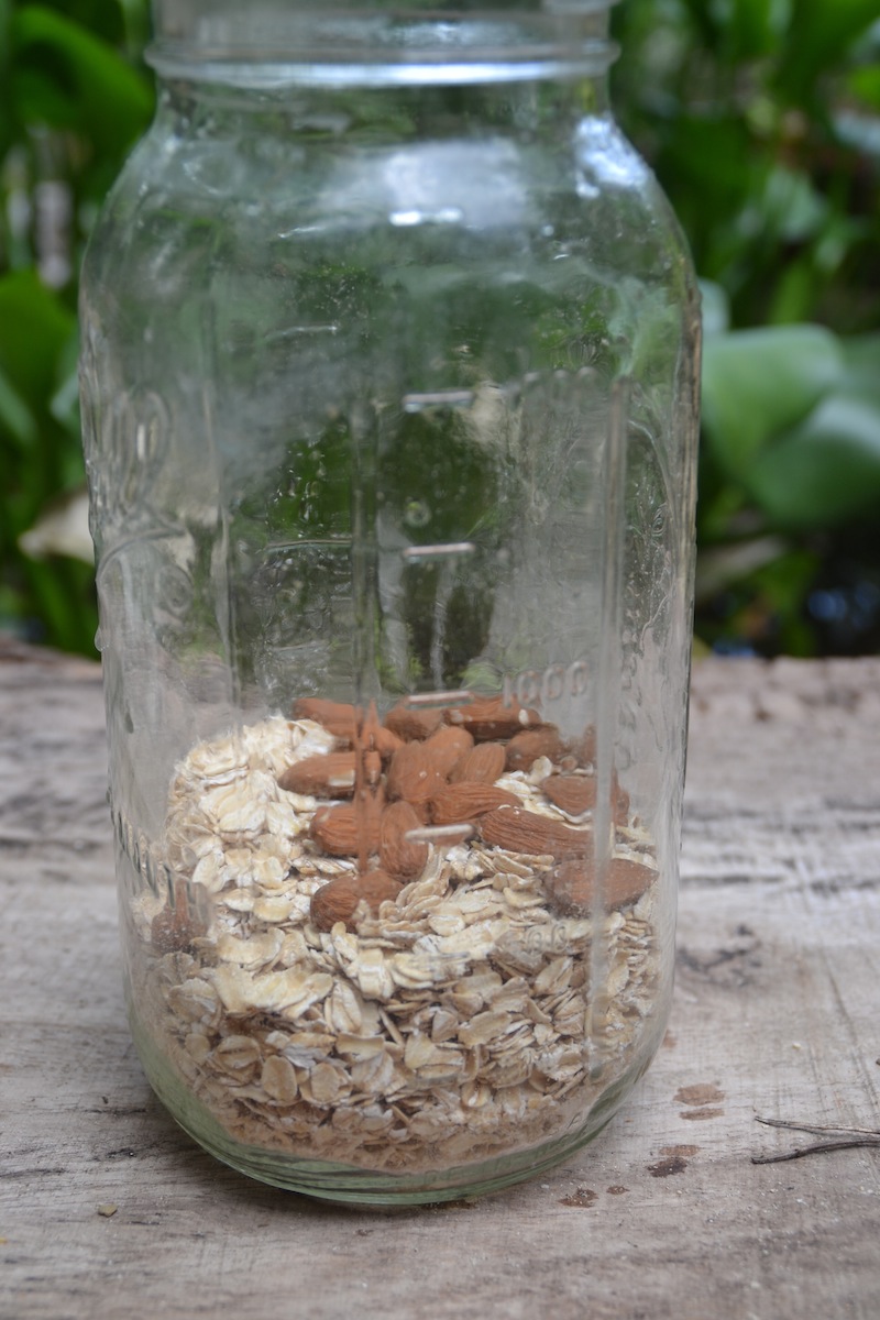 1. Measure out 2 cups of rolled oats and a handful of raw almonds (optional) into your jar or blender. Fill with water, stir, and drain a couple of times until the water comes off nearly clear – otherwise your final product will be somewhat mucilaginous (not a good texture for milk).